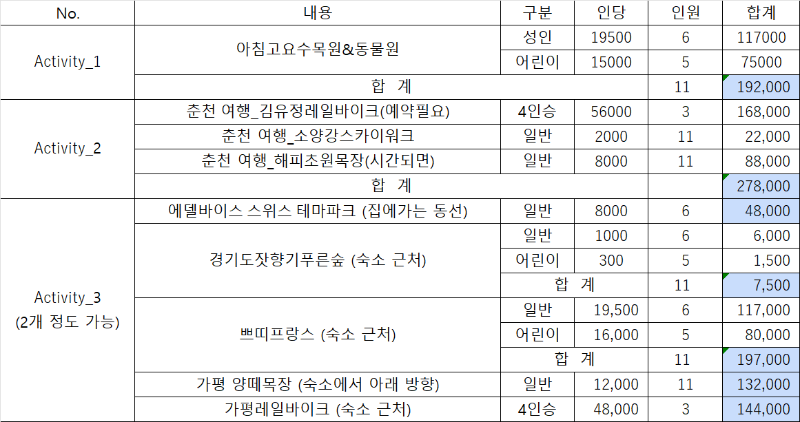 어버이날을 기념해 처가식구들과 가평을 다녀왔습니다.1박 2일 저렴한 팬션을 구했는데,, 포스팅 하기에는 너무 열악하여 액티비티 위주 활동만 남겨요~아래의 계획으로 짜보았고, 선택은 에델바이스 스위스 테마파크와 닭갈비로 마무리! 계획 대비 조촐해졌네요​마이다스밸리 청평골프클럽 앞에 위치한 에델바이스 스위스 테마파크는 디지털관광 주민증이 있으면 6천원으로 2천원 가량 할인이 됩니다. 성인의 경우 각자 가입해야 하는데요. 아이는 부모가 했을 경우 해당 가격으로 적용해줍니다. 직원분들이 엄격히 감시하지는 않지만 양심껏 하시면 될것 같아요. 입구 들어가면 바베큐 식당이 크게 있어요. 바베큐는 미리 예약을 해야하고 그 외는 키오스크를 통해 주문 가능합니다.스위스를 가보지는 못했지만 이런 분위기일까요? 규모가 크지는..