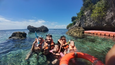 거기서 다른 가이드 두명을 만나 카누같은 배를 타고 바다로 향했다. 올라타기가 힘든배였는데 바다에서 내리고 다시 올라가기도 상당히 어려웠다. 둘째, 셋째는 준비해간 작은 마스크형 스노클링을 챙겨갔는데 정작 얼굴이 작아서 그런지 물이 자꾸 셌다. 바다에는 아이들이 잘 뛰어들었는데 둘째는 물이 세서 울고 난리였다. 조류도 세서 정신이 없는데 애들도 챙기려니 여러모로 누리기는 어려웠던 것 같다. 그래도 다행히 애엄마와 첫째는 스노클링을 잘 즐기는 것 같았는데 들어보니 애엄마 스노클링도 물이 세서 좀 잘 못누렸던 듯 하다.